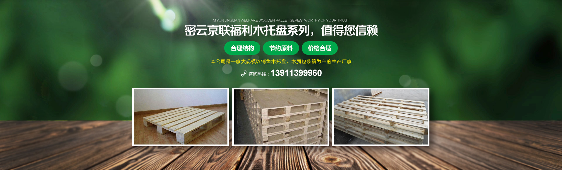 北京京聯(lián)國(guó)順木制品有限公司 (原北京市密云縣京聯(lián)福利木制品廠)成立于1993年,位于北京市密云縣西田各莊鎮(zhèn)蒼頭村,占地約5000平米。我公司工廠是一家大規(guī)模以銷售木托盤為主的生產(chǎn)廠家。本工廠是一家直接采購(gòu)原木,按客戶要求生產(chǎn)規(guī)格尺寸的托盤,我公司工廠位于河北省承德市有著木材加工點(diǎn),可以做到,從山上的木頭下山到客戶手中的托盤都是一手貨,減少了中間商的費(fèi)用,所以我公司售出的產(chǎn)品對(duì)北京這個(gè)龐大的市場(chǎng)來說在同樣的規(guī)格尺寸的托盤來說價(jià)格比較占優(yōu)勢(shì)。